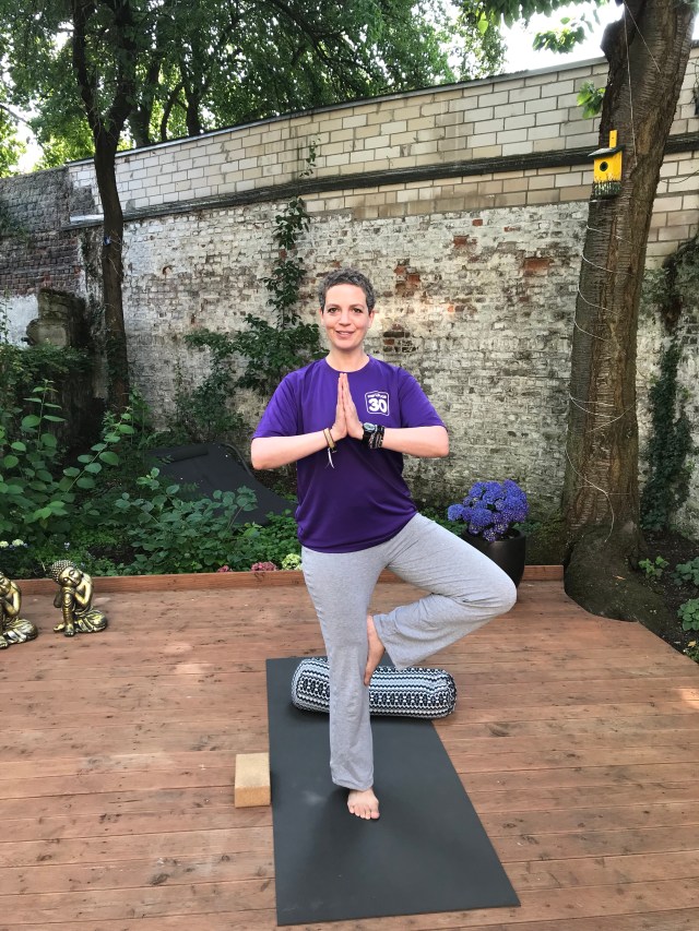 #Stepupfor30 – I start the day with an hour of „gentle yoga“ at I’m possible yoga in my purple Bowel Cancer UK t-shirt and love it. The peace on the wooden deck, the singing birds, the blue sky and the fresh air…. I ride my bike to Nippes for a joined Thai back massage with Maja and back for physiotherapy with Frau Dietrich. So far, a lot of appointments, once again, but they are all good for me!