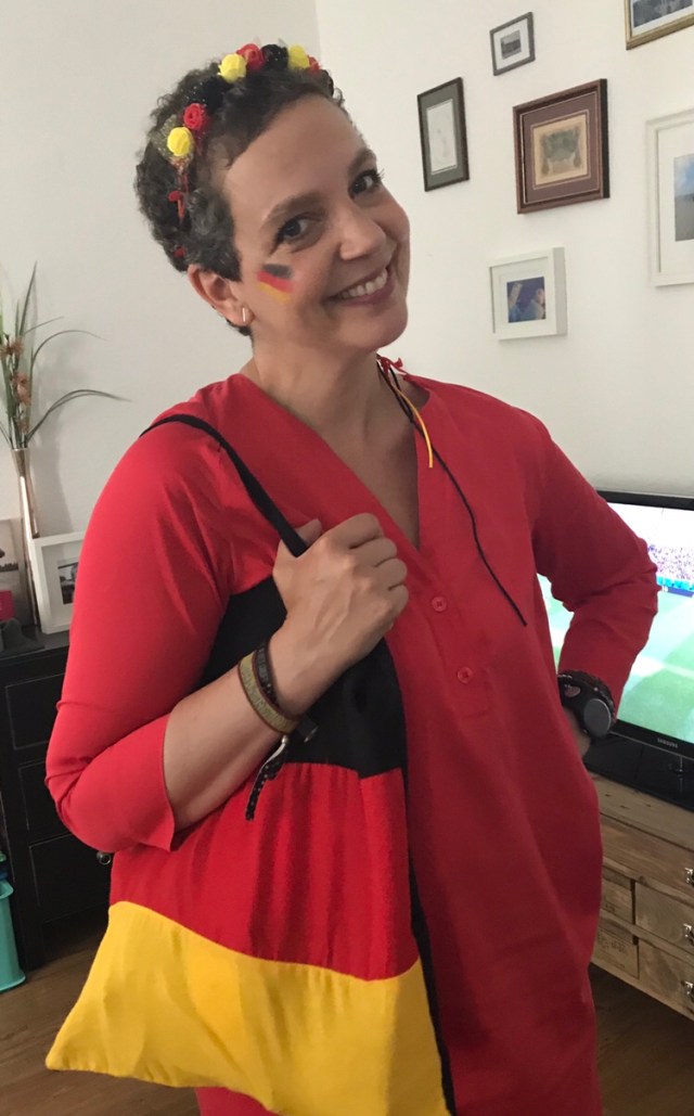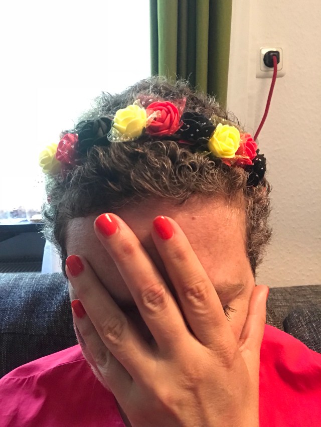 Why? Because I want a bit more football euphoria – this worldcup is missing Turkey, Italy and the Netherlands…. onwards and upwards! Black, red and yellow flower chains, face colours, wigs, tattoos, candy…. bring on today’s game! I collect the kids, we are all dressed, I paint all the kindergarten kids‘ faces with my new tricolor pen and meet the Mummy gang & kids to watch the game!