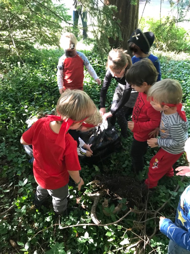 I spend my afternoon in a little Pirat world with sticky happy kids, glowing cheeks, cheers and laughter, Pirat songs yelled on top of their lungs, a tug of war with trembling bodies and little feet counting their steps through the underwood, while clinging to their stained and burned treasure map….the excitement of plunging voices and dirty fingers digging through gold nuggets.