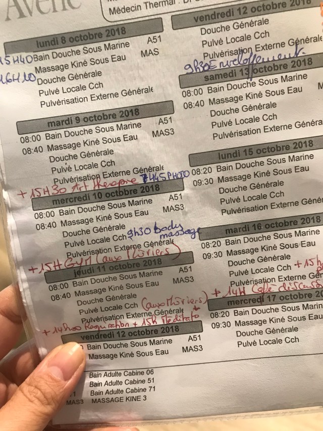 I get a prescription for baths, massages and wraps and the clinic arranges a schedule accordingly. Martine and Elise have lunch with Lindsay, her Mum and us and take our hand to guide us through treatment. They reserve the Monday afternoons to new arrivals and show them the tricks, so we are ready to face the busy treatment mornings and know where to go.