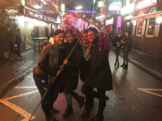 Four short hair girls celebrating life and normal things… singing, dancing and drinking! •