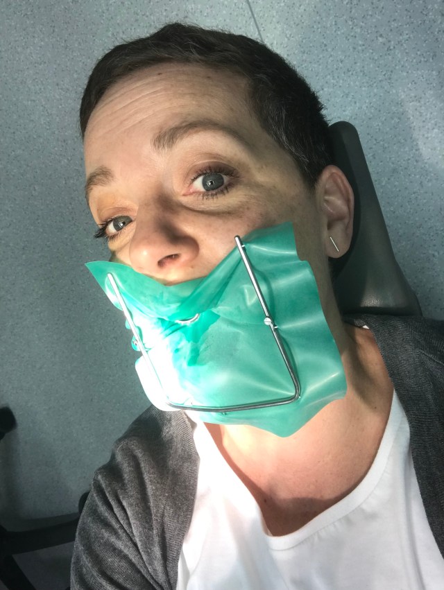 Step one – take out the old filling and clean the root canals…. Pfew…. it stinks like an old fish pond! Why do I need have clean root canals?!? Any infection – and there is one on my jaw bone – needs to be gone prior to starting treatment, as I risk loosing my jawbone all together 🙀