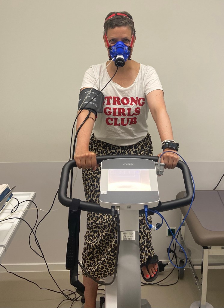 Es ist super spannend. Ich bin mit meinem Papierkram bestens vorbereitet, aber hab natürlich keine Sportklamotten dabei…. Well, so sitze ich bei 32 Grad im zum Glück klimatisierten Klinikzimmer auf dem Rad – und ich finde in einem durchaus passenden Outfit 😉 – und meine Belastungsgrenzen werden ausgelotet – zumindest die physischen. Mein psychischer Zustand wird anhand vieler Seiten voller Fragen erhoben.